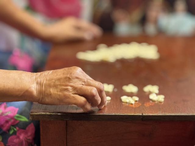 “En cuanto a los grupos de cinco granos de maíz, tienen que ver con los cinco rumbos del universo. Además, hacen montones de 40 granos, lo que está relacionado con la cuenta vigesimal. Sin saberlo, practican un lenguaje metafórico prehispánico, un lenguaje que está a punto de morir.”, explica.