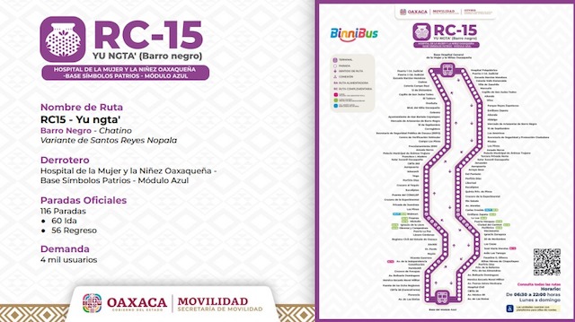 Por su parte la directora del BinniBus, Karina Gómez Esteban detalló que por el reordenamiento de trayectos se fusionan las rutas RC02 y RC04 para integrar la RC15 Hospital de la Mujer y la Niñez Oaxaqueña – Base Símbolos Patrios – Módulo Azul, denominada YU NGTA’, que significa Barro Negro en lengua chatina de Santos Reyes Nopala. Contará con 116 paradas oficiales, 60 de ida y 56 de regreso y operará en un horario de 6:30 a 22:00 horas.